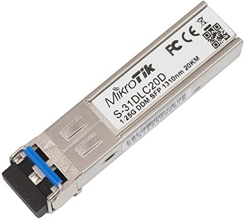 Mikrotik S-31DLC20D Single Mode SFP is a 1.25G SFP transceiver with a 1310nm Dual LC connector, for up to 20 km Single Mode fiber connections, with DDM.